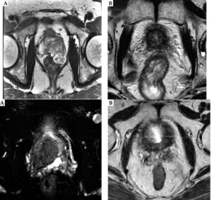 The Upper Image: Axial T2-weighted magnetic resonance images of the prostate of case 1. A) Locally advanced prostate ductal adenocarcinoma (PDA) before the treatment. Note that a large prostate tumor extends into the rectal wall (T3b); B) The shrinkage of the tumor observed at 11 years after the treatment. The Lower image: Axial T2-weighted magnetic resonance images of the prostate of case 2. A) Locally advanced prostate ductal adenocarcinoma (PDA) before the treatment. Note that a large prostate tumor extends into the right seminal vesicle (T3b); B) The shrinkage of the tumor observed at 8 years after the treatment.