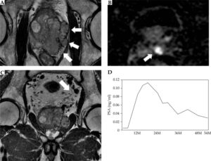 Representative T3bN1 case treated by tri-modality with whole pelvis external beam radiotherapy (EBRT). Case: 68-yearold man with initial prostate-specific antigen (PSA) 65 ng/ml. The needle biopsy Gleason’s score was 4+4. Clinical stage was T3bN1. Magnetic resonance imaging shows (A) a bulky prostate tumor extending over the capsule and compressing the rectal wall (B) with seminal vesicle invasion, and (C) nodal metastasis as indicated by white arrows. The patient was treated by combination therapy with low-dose-rate (LDR) brachytherapy, whole pelvis EBRT, and androgen deprivation therapy (ADT). Upon seeds implantation, they were implanted in seminal vesicle as well as prostate [15]; (D) PSA change after treatment: PSA shows temporal increase after cessation of ADT, but continuous decrease was observed thereafter. Y axis shows the period (months) from completion of the EBRT