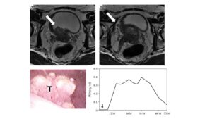 具体的には、本論文が対象とした143例はPSAの平均値が20ng/ml以上でありPSA値が100ng/mlを超える症例も含まれ、ステージでいえばT3a以上 (T3a, T3b, T4) の局所進行前立腺癌症例が63%を占めています。また骨盤内リンパ節転移を伴う症例も5症例含まれています(これらリンパ節転移を有していた5症例はいずれも、後に述べるような全骨盤への外部照射を併用したトリモダリティ治療を行うことにより再発なく経過しています:代表的なリンパ節転移を認める症例として骨盤内を占拠し精嚢浸潤を伴う局所進行前立腺癌T3bN1:治療前PSA=65ng/mlであった症例の完治例が本論文のFigure 2に提示してありますので御覧いただければ幸いです)。